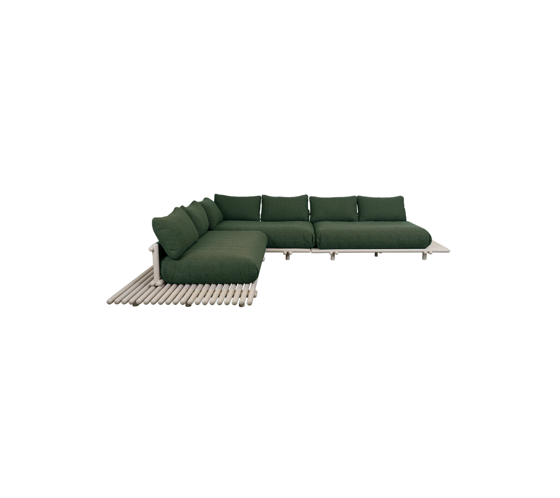 The plush seating and back cushions are crafted from resilient fabric and feature our QuickDry & Airflow system, ensuring quick drying and optimal air circulation for lasting comfort, even after rain. With its modular design, the Sticks Platform corner sofa creates a relaxed and inviting outdoor setting. Enhance the experience by placing a tabletop on the Sticks Platform to create a practical surface for drinks, snacks or styling details, elegantly blending different materials for a personalized, stylish touch.